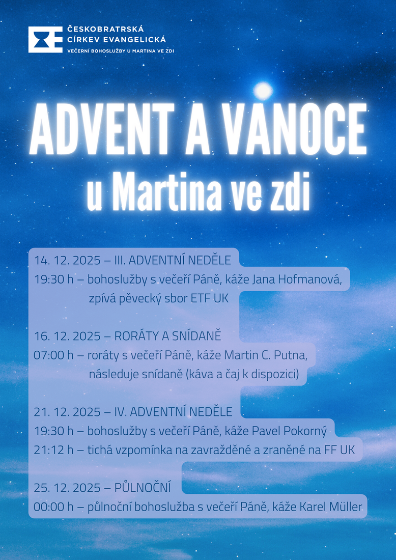 | 19.30 | večerní bohoslužby, II. adventní Jan Štefan, profesor systematické teologie na ETF UK s vysluhováním svaté večeře Páně |