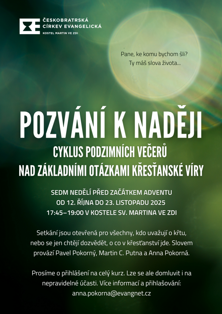 Cyklus podzimních večerů nad základními otázkami křesťanské víry: sedm nedělí před začátkem adventu od 12. října do 23. listopadu 2025, vždy 17:45–19:00 v kostele u Martina ve zdi.
