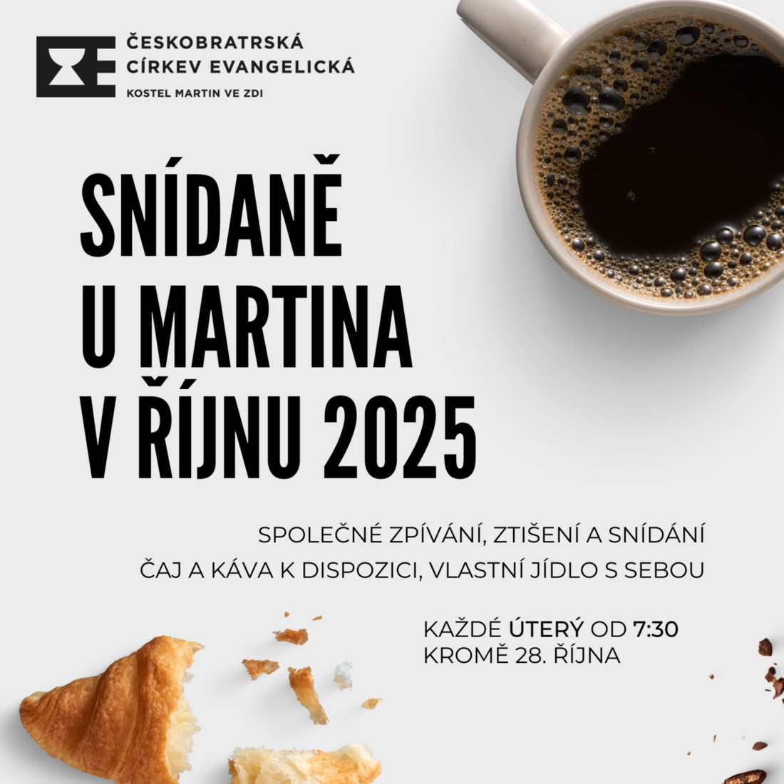 Úterní snídaně s pobožností se u Martina ve zdi v říjnu 2025 budou konat každé úterý od 7:30 kromě 28. října.
